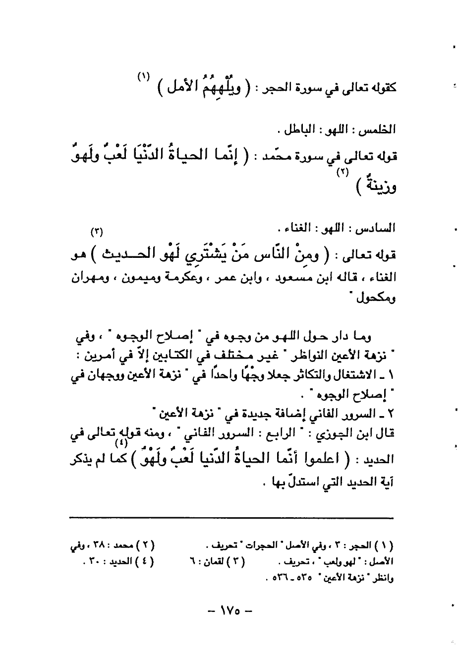 قوله تعالى: وَمِنَ النَّاسِ مَنْ يَشْتَرِي لَهْوَ الْحَدِيثِ (¬3) هو الغناء، قاله ابن مسعود، وابن عمر، وعكرمة وميمون، ومهران ومكحول» وما دار حول اللهو من وجوه في «إصلاح الوجوه»، وفي «نزهة الأعين النواظر» غير مختلف في الكتابين إلّا في أمرين: