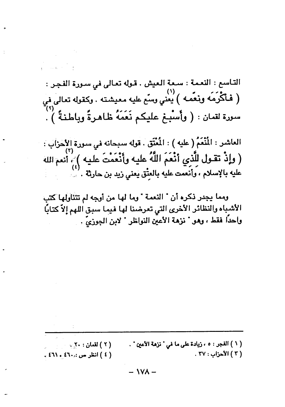 ومما يجدر ذكره أن «النعمة» وما لها من أوجه لم تتناولها كتب الأشباه والنظائر الأخرى التي تعرضنا لها فيما سبق اللهم إلّا كتابا واحدا فقط، وهو «نزهة الأعين النواظر» لابن الجوزيّ.