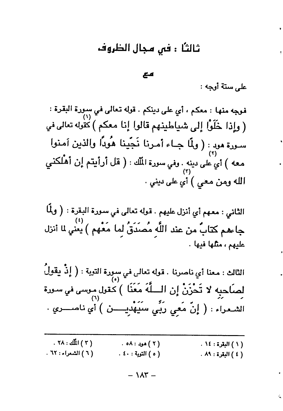 الثالث: معنا أي ناصرنا. قوله تعالى في سورة التوبة: إِذْ يَقُولُ لِصاحِبِهِ لا تَحْزَنْ إِنَّ اللَّهَ مَعَنا (¬5) كقول موسى في سورة الشعراء: إِنَّ مَعِي رَبِّي سَيَهْدِينِ (¬6) أي ناصري.