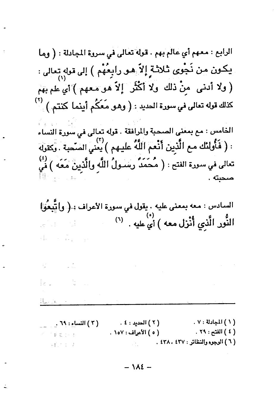 وَلا أَدْنى مِنْ ذلِكَ وَلا أَكْثَرَ إِلَّا هُوَ مَعَهُمْ (¬1) أي علم بهم كذلك قوله تعالى في سورة الحديد: وَهُوَ مَعَكُمْ أَيْنَ ما كُنْتُمْ (¬2) الخامس: مع بمعنى الصحبة والمرافقة. قوله تعالى في سورة النساء: فَأُولئِكَ مَعَ الَّذِينَ أَنْعَمَ اللَّهُ عَلَيْهِمْ (¬3) يعني الصّحبة. وكقوله تعالى في سورة الفتح: مُحَمَّدٌ رَسُولُ اللَّهِ وَالَّذِينَ مَعَهُ (¬4) في صحبته.
