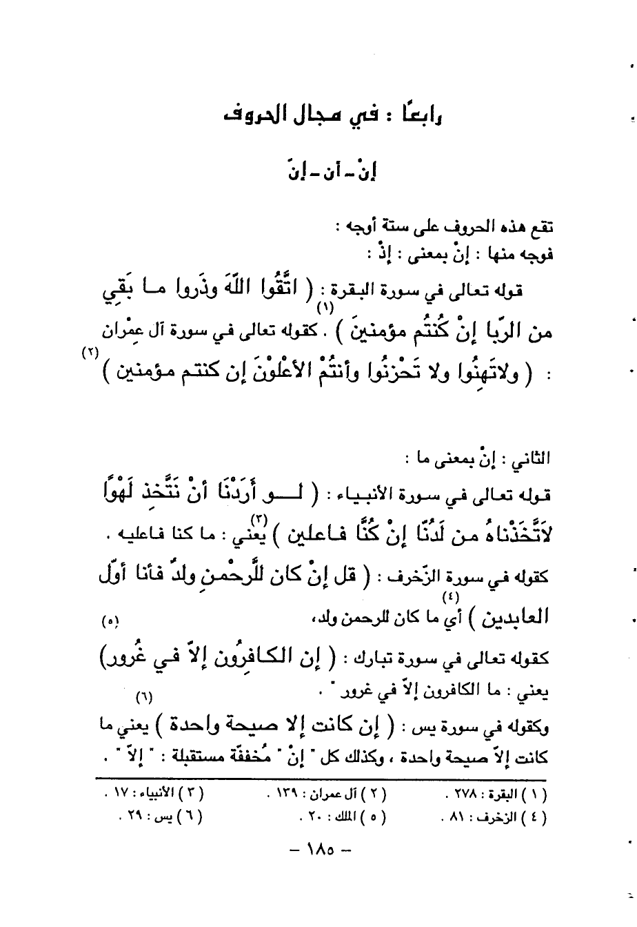 قوله تعالى في سورة البقرة: اتَّقُوا اللَّهَ وَذَرُوا ما بَقِيَ مِنَ الرِّبا إِنْ كُنْتُمْ مُؤْمِنِينَ. (¬1) كقوله تعالى في سورة آل عمران: وَلا تَهِنُوا وَلا تَحْزَنُوا وَأَنْتُمُ الْأَعْلَوْنَ إِنْ كُنْتُمْ مُؤْمِنِينَ (¬2) الثاني: إن بمعنى ما: