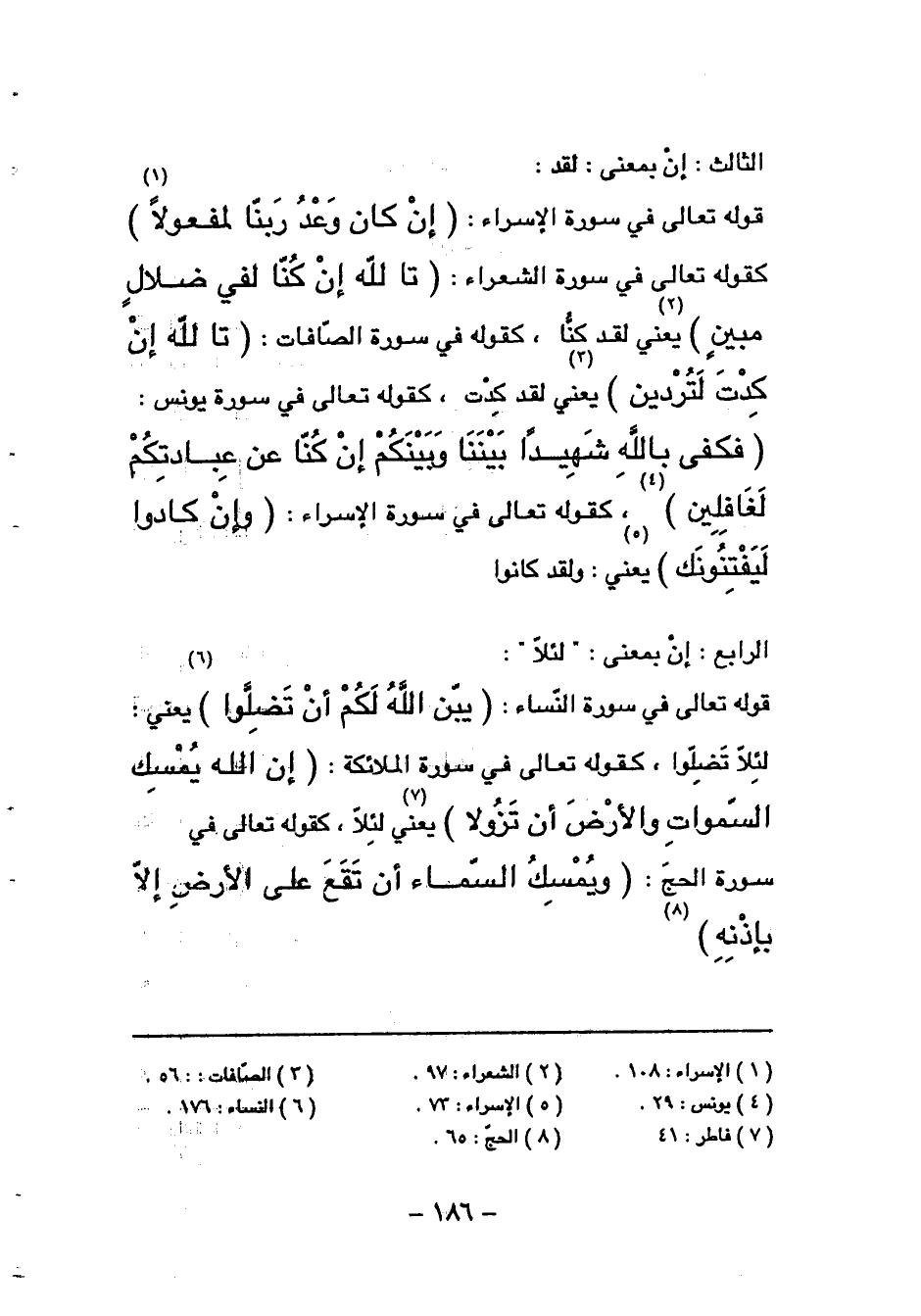 فَكَفى بِاللَّهِ شَهِيداً بَيْنَنا وَبَيْنَكُمْ إِنْ كُنَّا عَنْ عِبادَتِكُمْ لَغافِلِينَ (¬4)، كقوله تعالى في سورة الإسراء: وَإِنْ كادُوا لَيَفْتِنُونَكَ (¬5) يعني: ولقد كانوا الرابع: إن بمعنى: «لئلّا»: