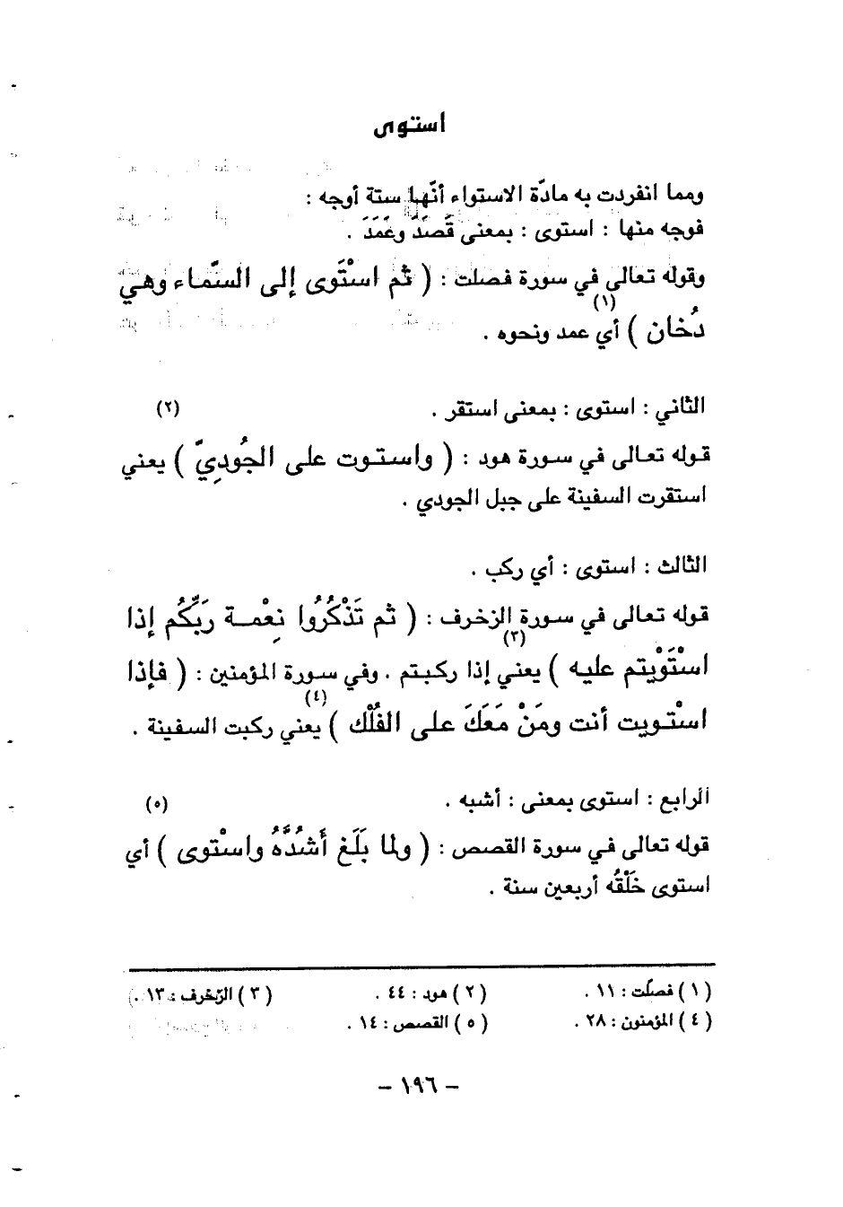 قوله تعالى في سورة الزخرف: ثُمَّ تَذْكُرُوا نِعْمَةَ رَبِّكُمْ إِذَا اسْتَوَيْتُمْ عَلَيْهِ (¬3) يعني إذا ركبتم. وفي سورة المؤمنين: فَإِذَا اسْتَوَيْتَ أَنْتَ وَمَنْ مَعَكَ عَلَى الْفُلْكِ (¬4) يعني ركبت السفينة.