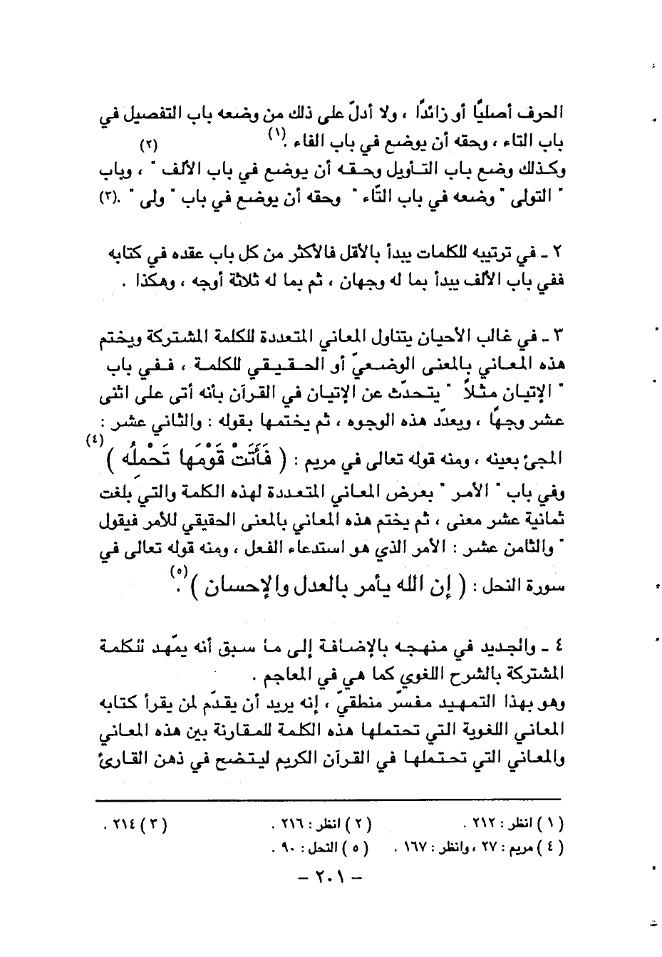 المجىء بعينه، ومنه قوله تعالى في مريم: فَأَتَتْ بِهِ قَوْمَها تَحْمِلُهُ (¬4) وفي باب «الأمر» بعرض المعاني المتعددة لهذه الكلمة والتي بلغت ثمانية عشر معنى، ثم يختم هذه المعاني بالمعنى الحقيقي للأمر فيقول «والثامن عشر: الأمر الذي هو استدعاء الفعل، ومنه قوله تعالى في سورة النحل: إِنَّ اللَّهَ يَأْمُرُ بِالْعَدْلِ وَالْإِحْسانِ (¬5).