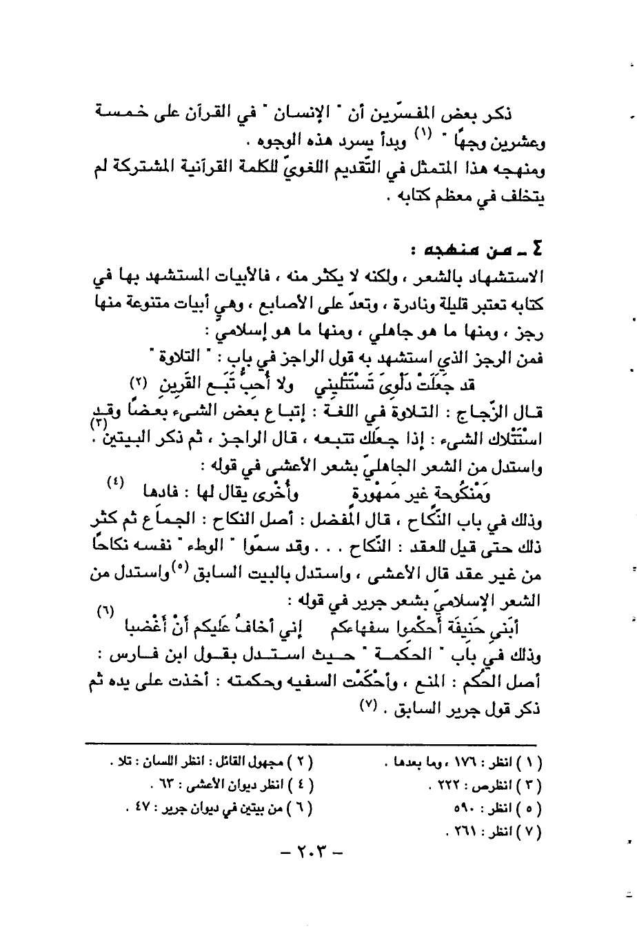 4 - من منهجه الاستشهاد بالشعر، ولكنه لا يكثر منه، فالأبيات المستشهد بها في كتابه تعتبر قليلة ونادرة، وتعدّ على الأصابع، وهي أبيات متنوعة منها رجز، ومنها ما هو جاهلي، ومنها ما هو إسلامي:
