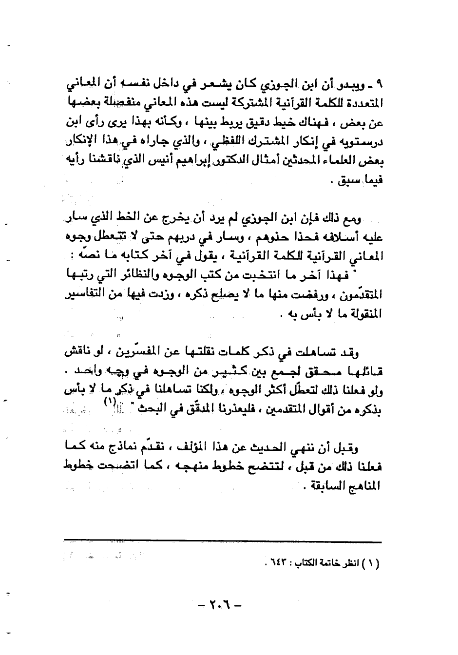 9 - ويبدو أن ابن الجوزي كان يشعر في داخل نفسه أن المعاني المتعددة للكلمة القرآنية المشتركة ليست هذه المعاني منفصلة بعضها عن بعض، فهناك خيط دقيق يربط بينها، وكأنه بهذا يرى رأى ابن درستويه في إنكار المشترك اللفظي، والذي جاراه في هذا الإنكار بعض العلماء المحدثين أمثال الدكتور إبراهيم أنيس الذي ناقشنا رأيه فيما سبق.