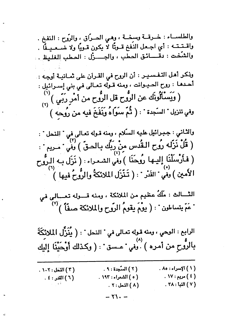 وَيَسْئَلُونَكَ عَنِ الرُّوحِ قُلِ الرُّوحُ مِنْ أَمْرِ رَبِّي (¬1) وفي تنزيل «السجدة»: ثُمَّ سَوَّاهُ وَنَفَخَ فِيهِ مِنْ رُوحِهِ (¬2) والثاني: جبرائيل عليه السّلام، ومنه قوله تعالى في «النحل»: