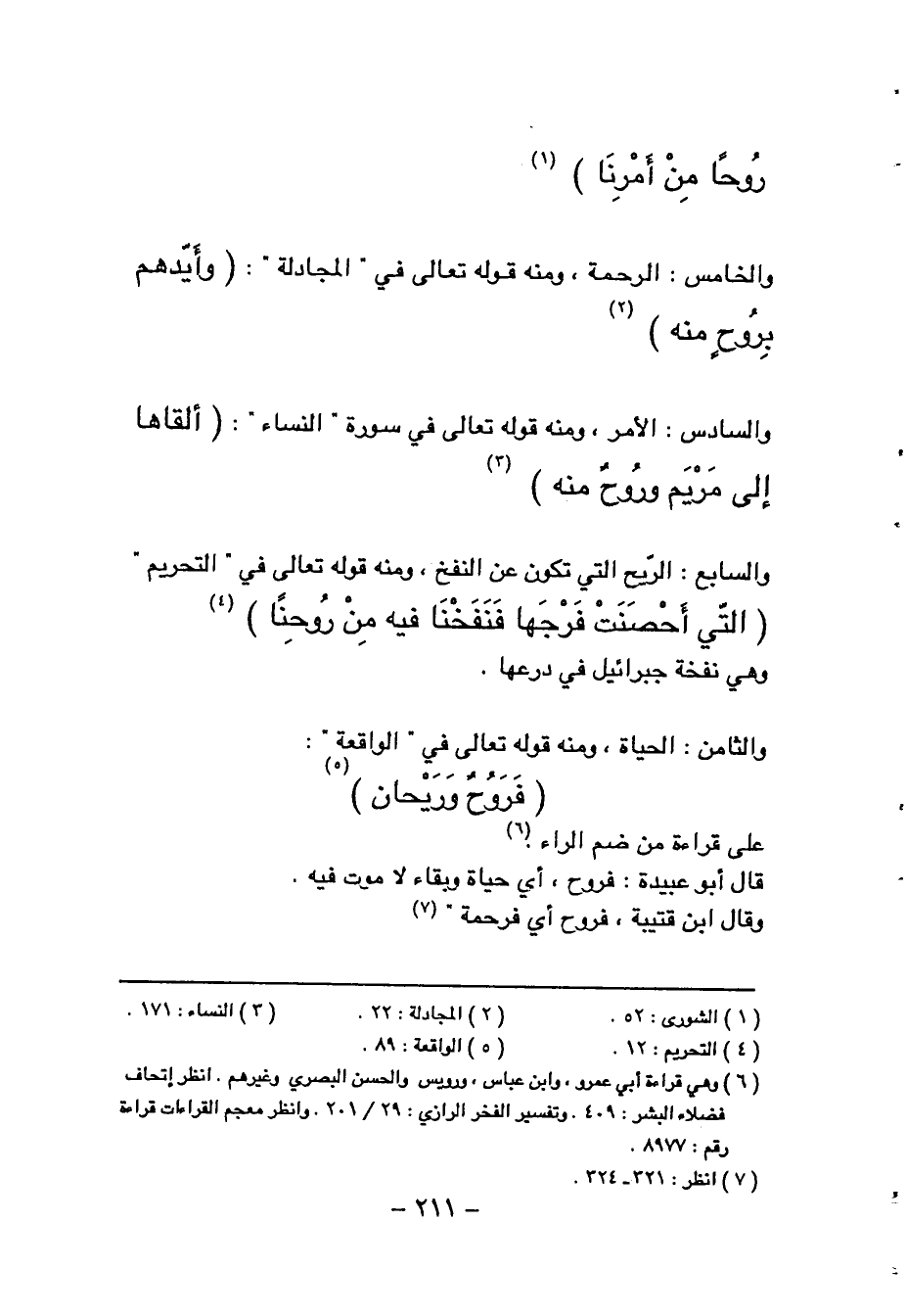 وَكَذلِكَ أَوْحَيْنا إِلَيْكَ رُوحاً مِنْ أَمْرِنا (¬1) والخامس: الرحمة، ومنه قوله تعالى في «المجادلة»: وَأَيَّدَهُمْ بِرُوحٍ مِنْهُ (¬2) والسادس: الأمر، ومنه قوله تعالى في سورة «النساء»: أَلْقاها إِلى مَرْيَمَ وَرُوحٌ مِنْهُ (¬3) والسابع: الرّيح التي تكون عن النفخ، ومنه قوله تعالى في «التحريم» الَّتِي أَحْصَنَتْ فَرْجَها فَنَفَخْنا فِيهِ مِنْ رُوحِنا (¬4) وهي نفخة جبرائيل في درعها.