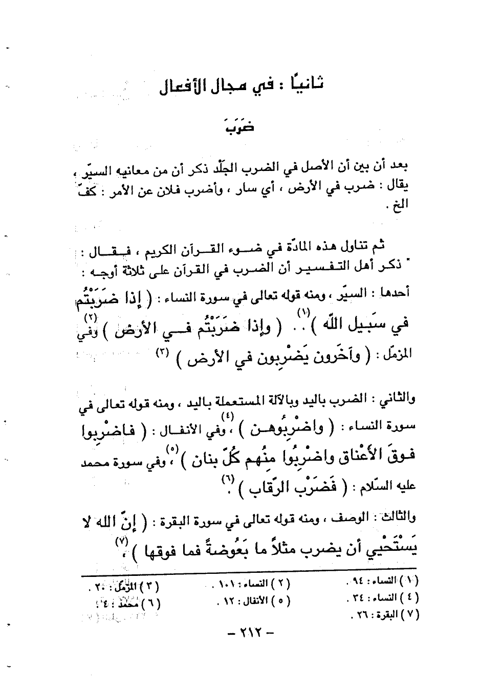 أحدها: السيّر، ومنه قوله تعالى في سورة النساء: إِذا ضَرَبْتُمْ فِي سَبِيلِ اللَّهِ (¬1) .. وَإِذا ضَرَبْتُمْ فِي الْأَرْضِ (¬2) وفي المزمّل: وَآخَرُونَ يَضْرِبُونَ فِي الْأَرْضِ (¬3) والثاني: الضرب باليد وبالآلة المستعملة باليد، ومنه قوله تعالى في سورة النساء: وَاضْرِبُوهُنَّ، (¬4) وفي الأنفال: فَاضْرِبُوا فَوْقَ الْأَعْناقِ وَاضْرِبُوا مِنْهُمْ كُلَّ بَنانٍ (¬5)، وفي سورة محمد عليه السّلام: فَضَرْبَ الرِّقابِ (¬6).