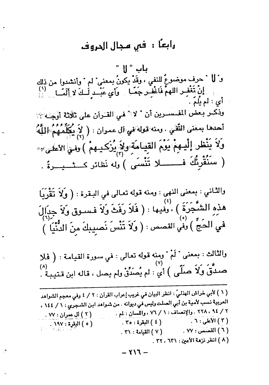 أحدها بمعنى النّفي. ومنه قوله في آل عمران: لا يُكَلِّمُهُمُ اللَّهُ وَلا يَنْظُرُ إِلَيْهِمْ يَوْمَ الْقِيامَةِ وَلا يُزَكِّيهِمْ (¬2) وفي الأعلى: