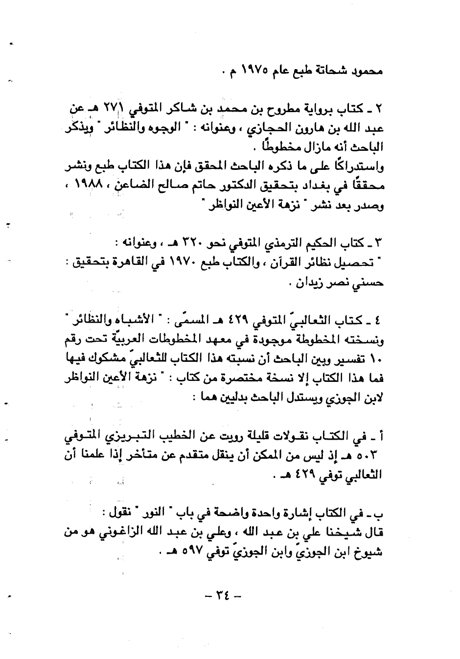 4 - كتاب الثعالبيّ المتوفي 429 هـ المسمّى: «الأشباه والنظائر» ونسخته المخطوطة موجودة في معهد المخطوطات العربيّة تحت رقم 10 تفسير وبين الباحث أن نسبته هذا الكتاب للثعالبيّ مشكوك فيها فما هذا الكتاب إلا نسخة مختصرة من كتاب: «نزهة الأعين النواظر لابن الجوزي ويستدل الباحث بدليين هما: