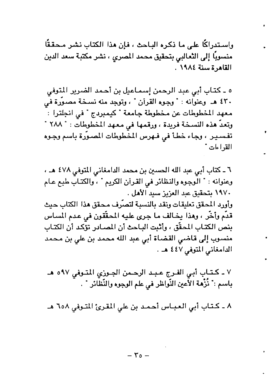 وتعدّ هذه النسخة فريدة، ورقمها في معهد المخطوطات: «288» تفسير، وجاء خطأ في فهرس المخطوطات المصورة باسم وجوه القراءات» 6 - كتاب أبي عبد الله الحسين بن محمد الدامغاني المتوفي 478 هـ، وعنوانه: «الوجوه والنظائر في القرآن الكريم»، والكتاب طبع عام 1970 بتحقيق عبد العزيز سيد الأهل.