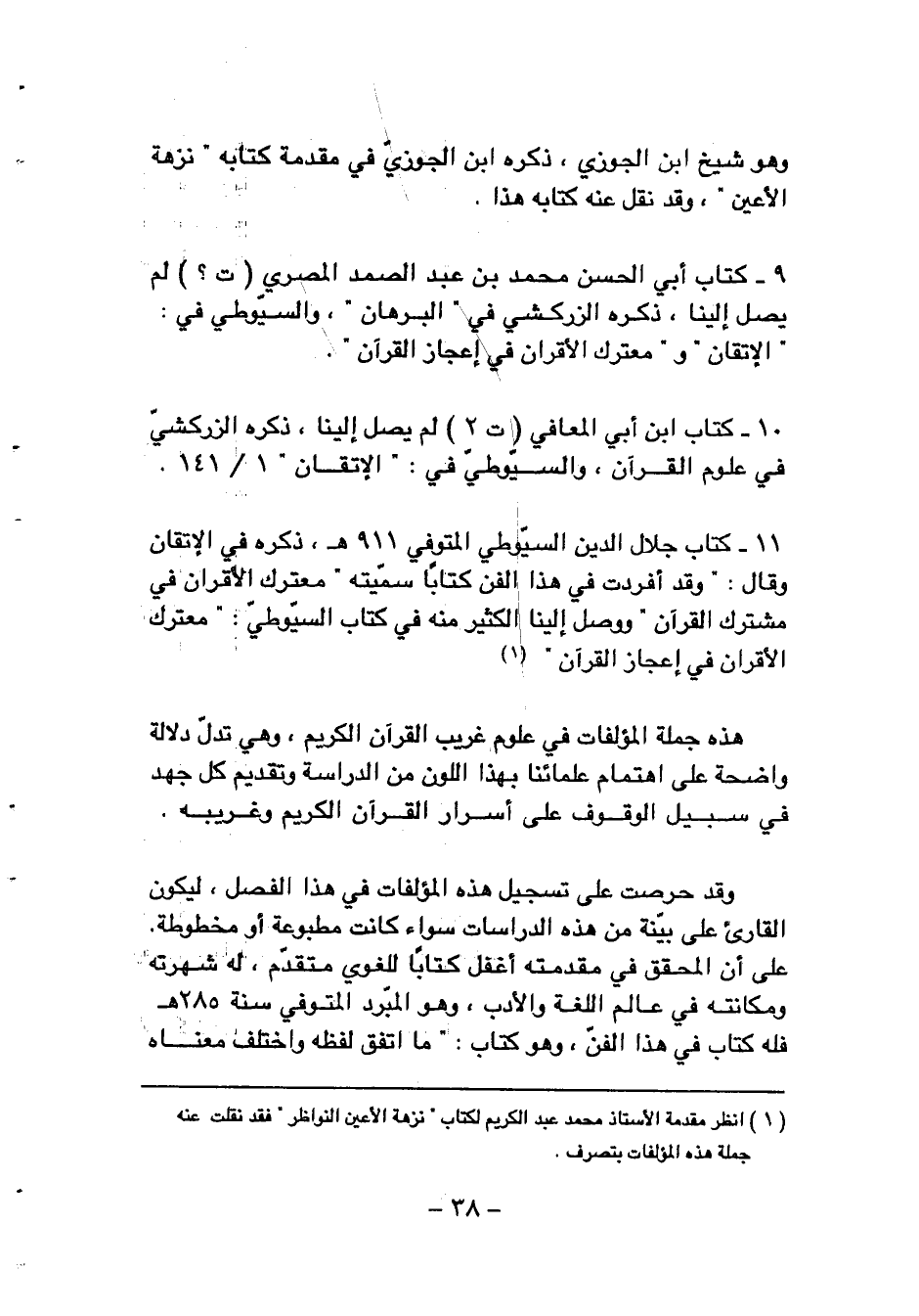 11 - كتاب جلال الدين السيّوطي المتوفي 911 هـ، ذكره في الإتقان وقال: «وقد أفردت في هذا الفن كتابا سمّيته معترك الأقران في مشترك القرآن» ووصل إلينا الكثير منه في كتاب السيّوطيّ: «معترك الأقران في إعجاز القرآن» (¬1) هذه جملة المؤلفات في علوم غريب القرآن الكريم، وهي تدلّ دلالة واضحة على اهتمام علمائنا بهذا اللون من الدراسة وتقديم كل جهد في سبيل الوقوف على أسرار القرآن الكريم وغريبه.
