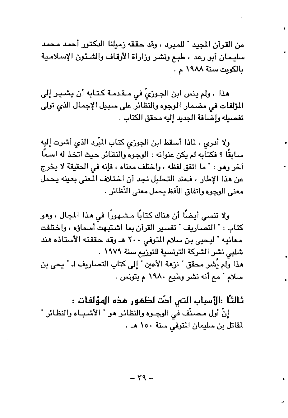ولا أدري، لماذا أسقط ابن الجوزي كتاب المبرّد الذي أشرت إليه سابقا؟ فكتابه لم يكن عنوانه: الوجوه والنظائر حيث اتخذ له اسما آخر وهو: «ما اتفق لفظه، واختلف معناه، فإنه في الحقيقة لا يخرج عن هذا الإطار، فعند التحليل نجد أن اختلاف المعنى بعينه يحمل معنى الوجوه واتفاق اللّفظ يحمل معنى النّظائر.