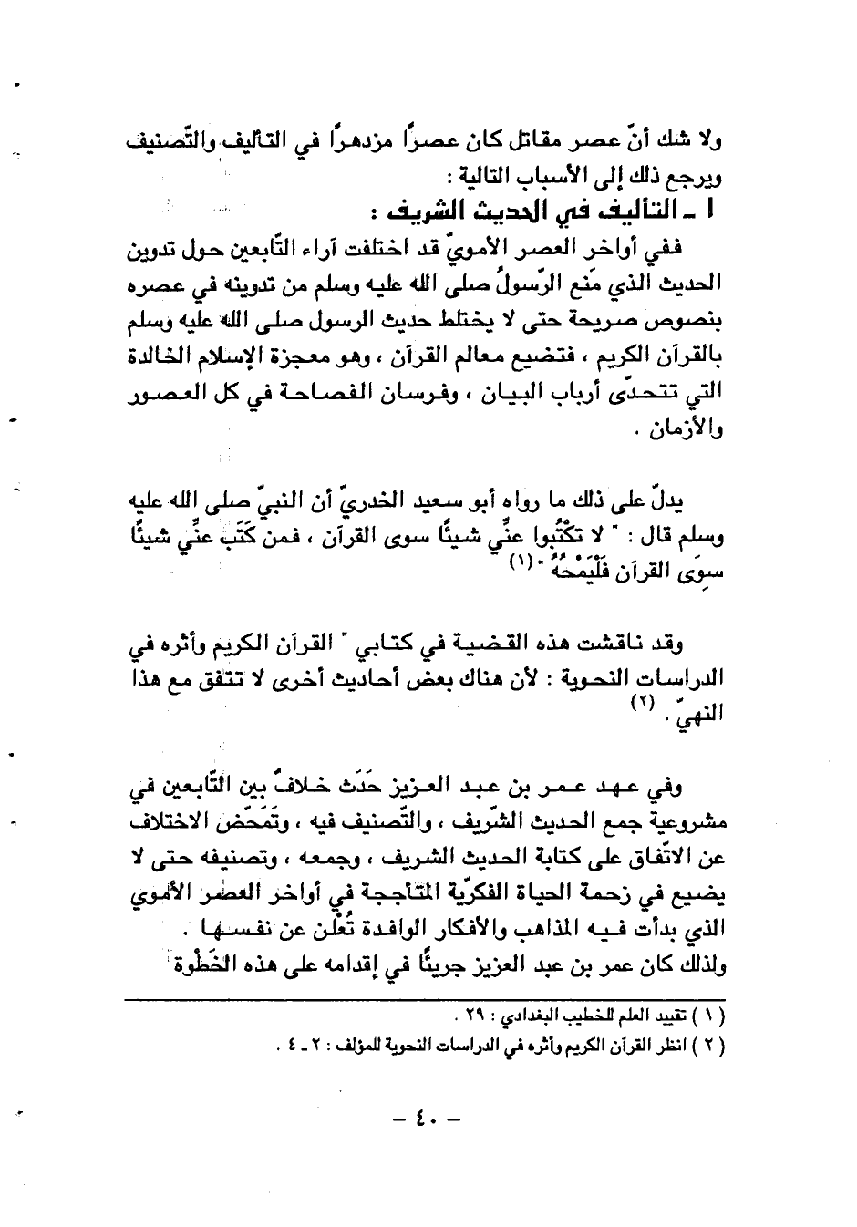 ففي أواخر العصر الأمويّ قد اختلفت آراء التّابعين حول تدوين الحديث الذي منع الرّسول صلى الله عليه وسلم من تدوينه في عصره بنصوص صريحة حتى لا يختلط حديث الرسول صلى الله عليه وسلم بالقرآن الكريم، فتضيع معالم القرآن، وهو معجزة الإسلام الخالدة التي تتحدّى أرباب البيان، وفرسان الفصاحة في كل العصور والأزمان.