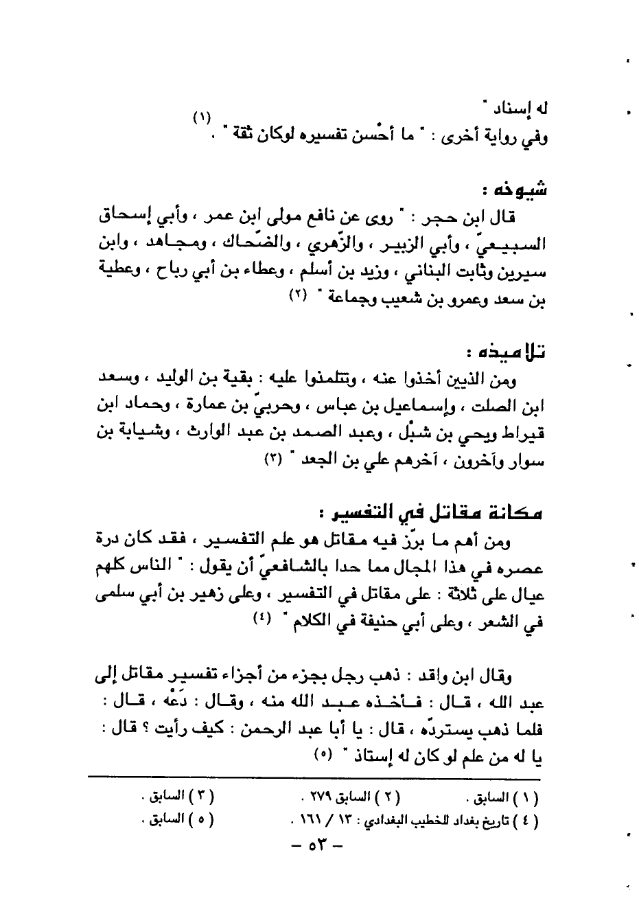 ومن أهم ما برّز فيه مقاتل هو علم التفسير، فقد كان درة عصره في هذا المجال مما حدا بالشافعي أن يقول: «الناس كلهم عيال على ثلاثة: على مقاتل في التفسير، وعلى زهير بن أبي سلمى في الشعر، وعلي أبي حنيفة في الكلام (¬4) وقال ابن واقد: ذهب رجل بجزء من أجزاء تفسير مقاتل إلى عبد الله، قال: فأخذه عبد الله منه، وقال: دعه، قال: