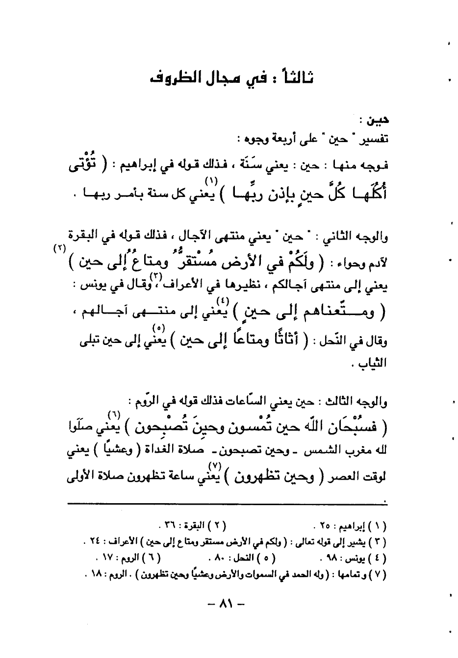 والوجه الثاني: «حين» يعني منتهى الآجال، فذلك قوله في البقرة لآدم وحواء: وَلَكُمْ فِي الْأَرْضِ مُسْتَقَرٌّ وَمَتاعٌ إِلى حِينٍ (¬2) يعني إلى منتهى آجالكم، نظيرها في الأعراف، (¬3) وقال في يونس: