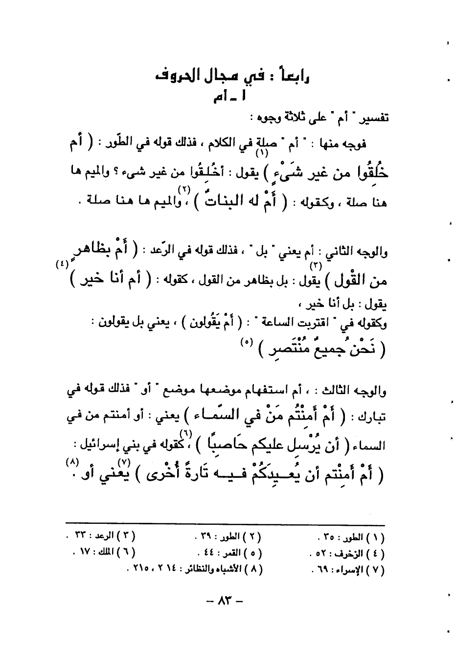فوجه منها: «أم» صلة في الكلام، فذلك قوله في الطّور: أَمْ خُلِقُوا مِنْ غَيْرِ شَيْءٍ (¬1) يقول: أخلقوا من غير شىء؟ والميم ها هنا صلة، وكقوله: أَمْ لَهُ الْبَناتُ، (¬2) والميم ها هنا صلة.