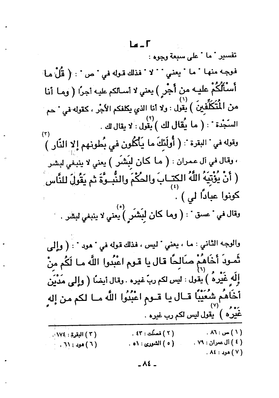 والوجه الثاني: ما، يعني «ليس، فذلك قوله في «هود»: وَإِلى ثَمُودَ أَخاهُمْ صالِحاً قالَ يا قَوْمِ اعْبُدُوا اللَّهَ ما لَكُمْ مِنْ إِلهٍ غَيْرُهُ (¬6) يقول: ليس لكم ربّ غيره. وقال أيضا وَإِلى مَدْيَنَ أَخاهُمْ شُعَيْباً قالَ يا قَوْمِ اعْبُدُوا اللَّهَ ما لَكُمْ مِنْ إِلهٍ غَيْرُهُ (¬7) يقول ليس لكم رب غيره.