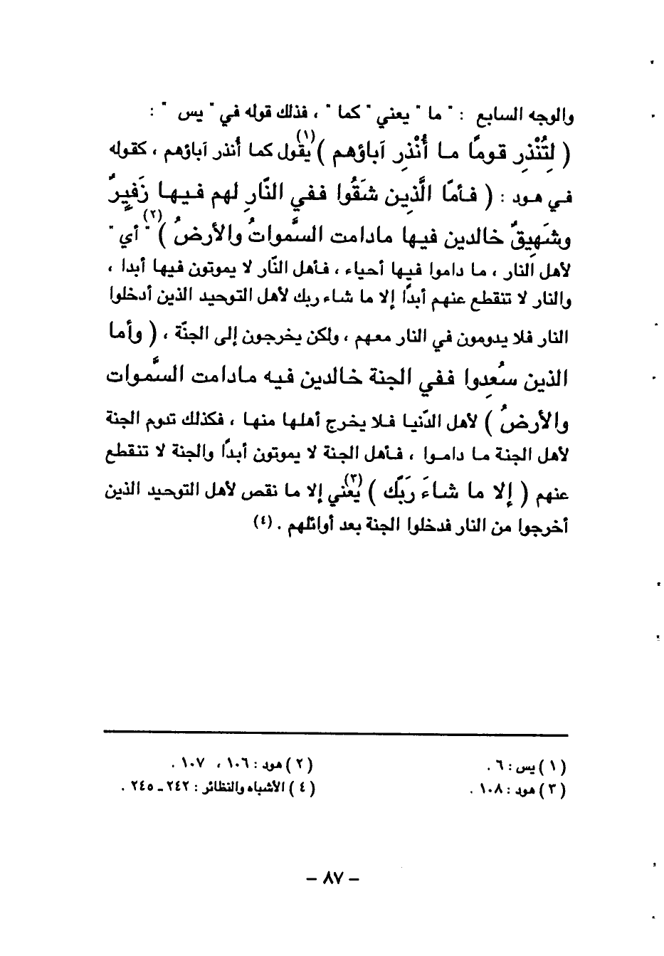 لِتُنْذِرَ قَوْماً ما أُنْذِرَ آباؤُهُمْ (¬1) يقول كما أنذر اباؤهم، كقوله في هود: فَأَمَّا الَّذِينَ شَقُوا فَفِي النَّارِ لَهُمْ فِيها زَفِيرٌ وَشَهِيقٌ خالِدِينَ فِيها ما دامَتِ السَّماواتُ وَالْأَرْضُ (¬2) «أي» لأهل النار، ما داموا فيها أحياء، فأهل النّار لا يموتون فيها أبدا، والنار لا تنقطع عنهم أبدا إلا ما شاء ربك لأهل التوحيد الذين أدخلوا النار فلا يدومون في النار معهم، ولكن يخرجون إلى الجنّة، وَأَمَّا الَّذِينَ سُعِدُوا فَفِي الْجَنَّةِ خالِدِينَ فِيها ما دامَتِ السَّماواتُ وَالْأَرْضُ لأهل الدّنيا فلا يخرج أهلها منها، فكذلك تدوم الجنة لأهل الجنة ما داموا، فأهل الجنة لا يموتون أبدا والجنة لا تنقطع عنهم إِلَّا ما شاءَ رَبُّكَ (¬3) يعني إلا ما نقص لأهل التوحيد الذين أخرجوا من النار فدخلوا الجنة بعد أوائلهم. (¬4)