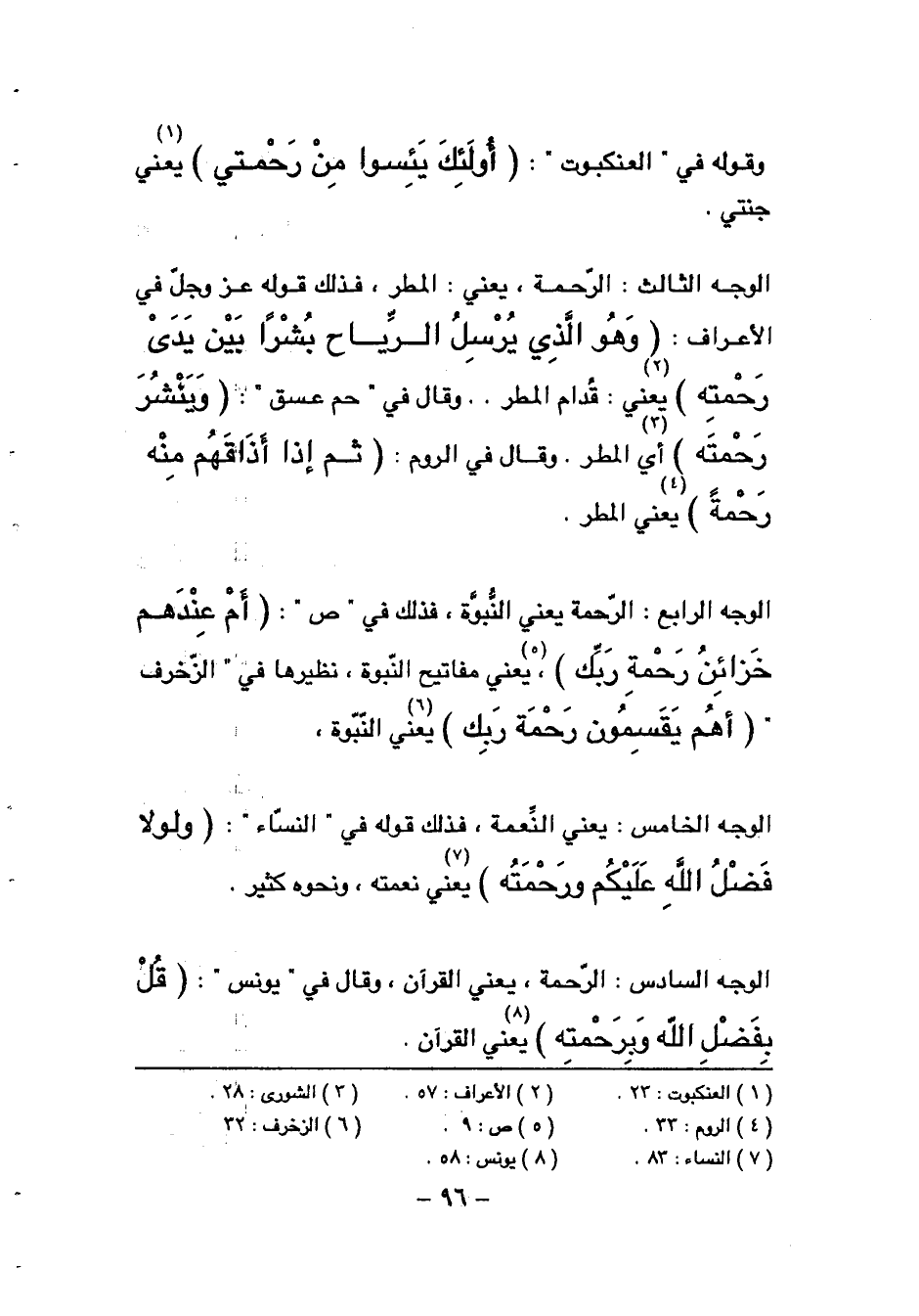 الوجه الرابع: الرّحمة يعني النّبوّة، فذلك في «ص»: أَمْ عِنْدَهُمْ خَزائِنُ رَحْمَةِ رَبِّكَ (¬5) يعني مفاتيح النّبوة، نظيرها في «الزّخرف أَهُمْ يَقْسِمُونَ رَحْمَتَ رَبِّكَ (¬6) يعني النّبوة، الوجه الخامس: يعني النّعمة، فذلك قوله في «النساء»: وَلَوْلا فَضْلُ اللَّهِ عَلَيْكُمْ وَرَحْمَتُهُ (¬7) يعني نعمته، ونحوه كثير.