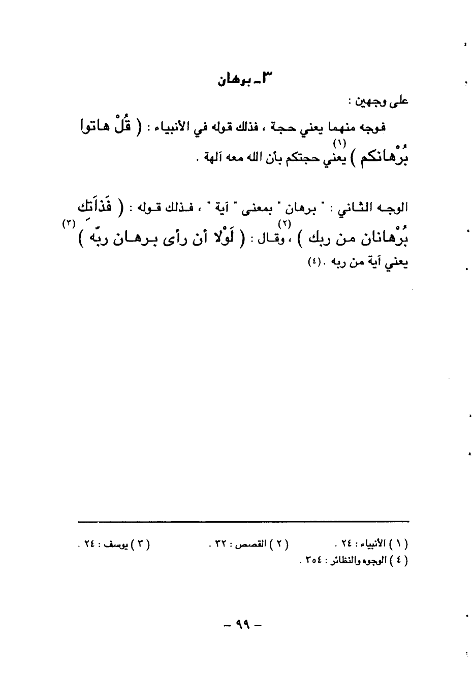 الوجه الثاني: «برهان» بمعنى «آية»، فذلك قوله: فَذانِكَ بُرْهانانِ مِنْ رَبِّكَ، (¬2) وقال: لَوْلا أَنْ رَأى بُرْهانَ رَبِّهِ (¬3) يعني آية من ربه. (¬4)