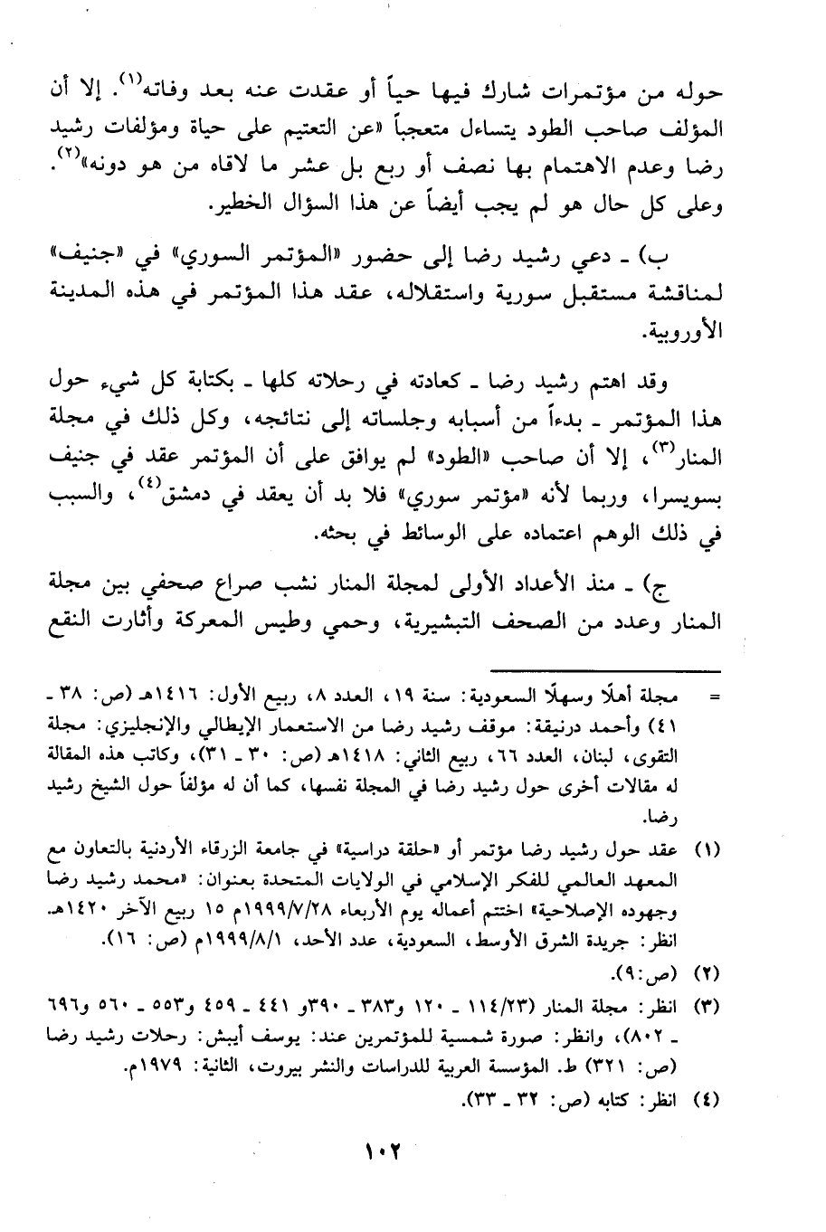 3 انظر: مجلة المنار (23/ 114 ـ 120 و383 ـ 390و 441 ـ 459 و553 ـ 560 و696 ـ 802) ، وانظر: صورة شمسية للمؤتمرين عند: يوسف أيبش: رحلات رشيد رضا (ص: 321) ط. المؤسسة العربية للدراسات والنشر بيروت، الثانية: 1979م.