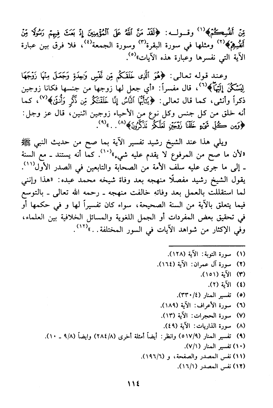 مِنْ أَنْفُسِكُمْ} 1 وقوله: {لَقَدْ مَنَّ اللَّهُ عَلَى الْمُؤْمِنِينَ إِذْ بَعَثَ فِيهِمْ رَسُولاً مِنْ أَنْفُسِهِمْ} 2 ومثلها في سورة البقرة 3 وسورة الجمعة 4، فلا فرق بين عبارة الآية التي نفسرها وعبارة هذه الآيات" 5.