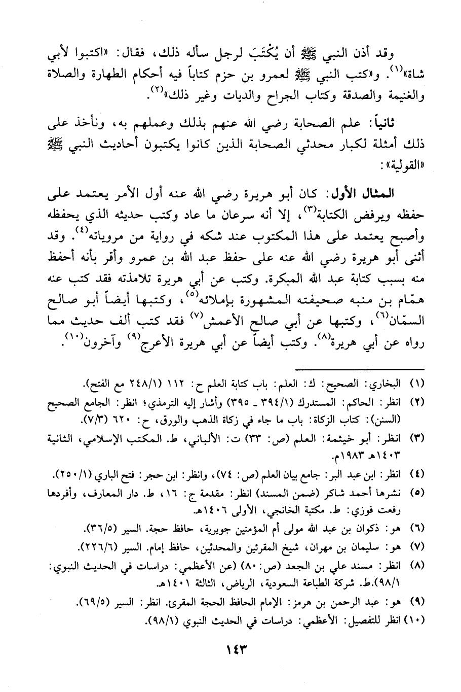 المثال الأول: كان أبو هريرة رضي الله عنه أول الأمر يعتمد على حفظه ويرفض الكتابة 3، إلا أنه سرعان ما عاد وكتب حديثه الذي يحفظه وأصبح يعتمد على هذا المكتوب عند شكه في رواية من مروياته 4. وقد أثنى أبو هريرة رضي الله عنه على حفظ عبد الله بن عمرو وأقر بأنه أحفظ منه بسبب كتابة عبد الله المبكرة. وكتب عن أبي هريرة تلامذته فقد كتب عنه همّام بن منبه صحيفته المشهورة بإملائه 5، وكتبها أيضاً أبو صالح السمّان 6، وكتبها عن أبي صالح الأعمش 7 فقد كتب ألف حديث مما رواه عن أبي هريرة 8. وكتب أيضاً عن أبي هريرة الأعرج 9 وآخرون 10.