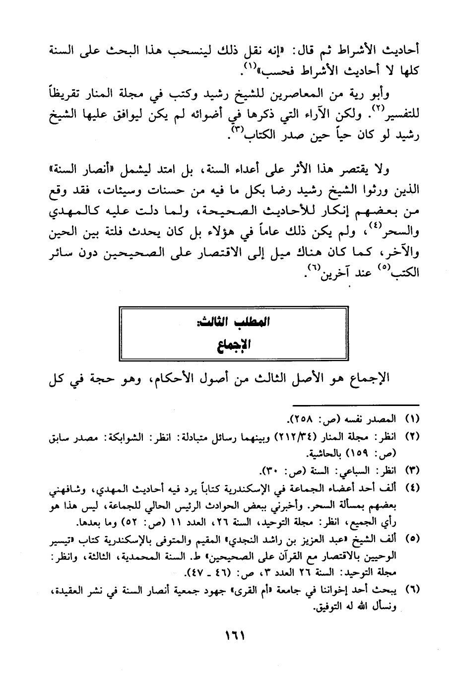 ولا يقتصر هذا الأثر على أعداء السنة، بل امتد ليشمل "أنصار السنة" الذين ورثوا الشيخ رشيد رضا بكل ما فيه من حسنات وسيئات، فقد وقع من بعضهم إنكار للأحاديث الصحيحة، ولما دلت عليه كالمهدي والسحر 4، ولم يكن ذلك عاماً في هؤلاء بل كان يحدث فلتة بين الحين والآخر، كما كان هناك ميل إلى الاقتصار على الصحيحين دون سائر الكتب 5 عند آخرين 6.