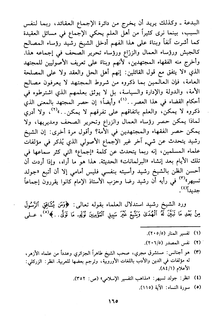 البدعة ـ وكذلك يريد أن يخرج من دائرة الإجماع العقائد، ربما لنفس السبب، بينما نرى كثيراً من أهل العلم يحكي الإجماع في مسائل العقيدة كما أشرت آنفاً وبناءً على هذا الفهم أدخل الشيخ رشيد رؤساء المصالح كالجيش ورؤساء العمال والزرّاع ورؤساء تحرير الصحف في إجماعه هذا. وأخرج منه الفقهاء المجتهدين، لأنهم وبناءً على تعريف الأصوليين للمجتهد الذي " لا يتفق مع قول القائلين: إنهم أهل الحل والعقد ولا على المصلحة العامة، فإن العالمين بما ذكروه من شروط المجتهد لا يعرفون مصالح الأمة، والدولة والإدارة والسياسة، بل لا يوثق بعلمهم الذي اشترطوه في أحكام القضاء في هذا العصر..1" وأيضاً" إن حصر المجتهد بالمعنى الذي ذكروه لا يمكن، والعلم باتفاقهم على تفرقهم لا يمكن.." 2، ولا أدري لماذا يمكن حصر رؤساء العمال والزراع وتحرير الصحف ومديريها، ولا يمكن حصر الفقهاء والمجتهدين في الأمة؟ ، وأقول مرة أخرى: إن الشيخ رشيد يتحدث عن شيء آخر غير الإجماع الأصولي الذي يُذكر في مؤلفات علماء المسلمين، إنه ربما يتحدث عن كلمة "إجماع" التي كثر سماعها في تلك الأيام بعد إنشاء " البرلمانات" الحديثة. هذا هو ما أراه، وإذا أردت أن أحسن الظن بالشيخ رشيد وأسيئه بنفسي فليس أمامي إلا أن أتبع "جولد تسهير" 3 في رأيه أن رشيد رضا وحزب الأستاذ الإمام كانوا يقررون إجماعاً جديداً 4.