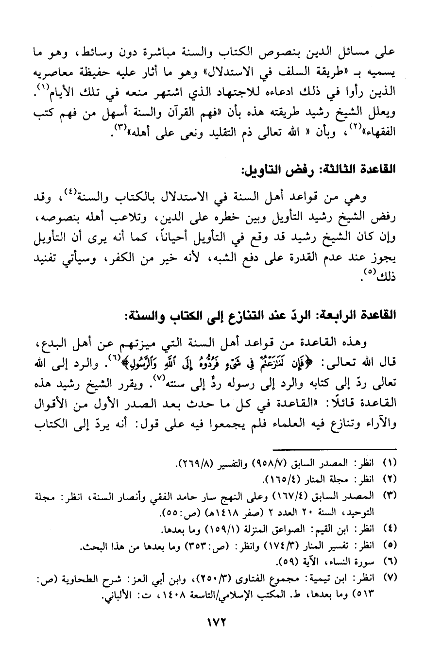 وهذه القاعدة من قواعد أهل السنة التي ميزتهم عن أهل البدع، قال الله تعالى: {فَإِنْ تَنَازَعْتُمْ فِي شَيْءٍ فَرُدُّوهُ إِلَى اللَّهِ وَالرَّسُولِ} 6. والرد إلى الله تعالى ردّ إلى كتابه والرد إلى رسوله ردٌّ إلى سنته 7. ويقرر الشيخ رشيد هذه القاعدة قائلاً: "القاعدة في كل ما حدث بعد الصدر الأول من الأقوال والآراء وتنازع فيه العلماء فلم يجمعوا فيه على قول: أنه يردّ إلى الكتاب