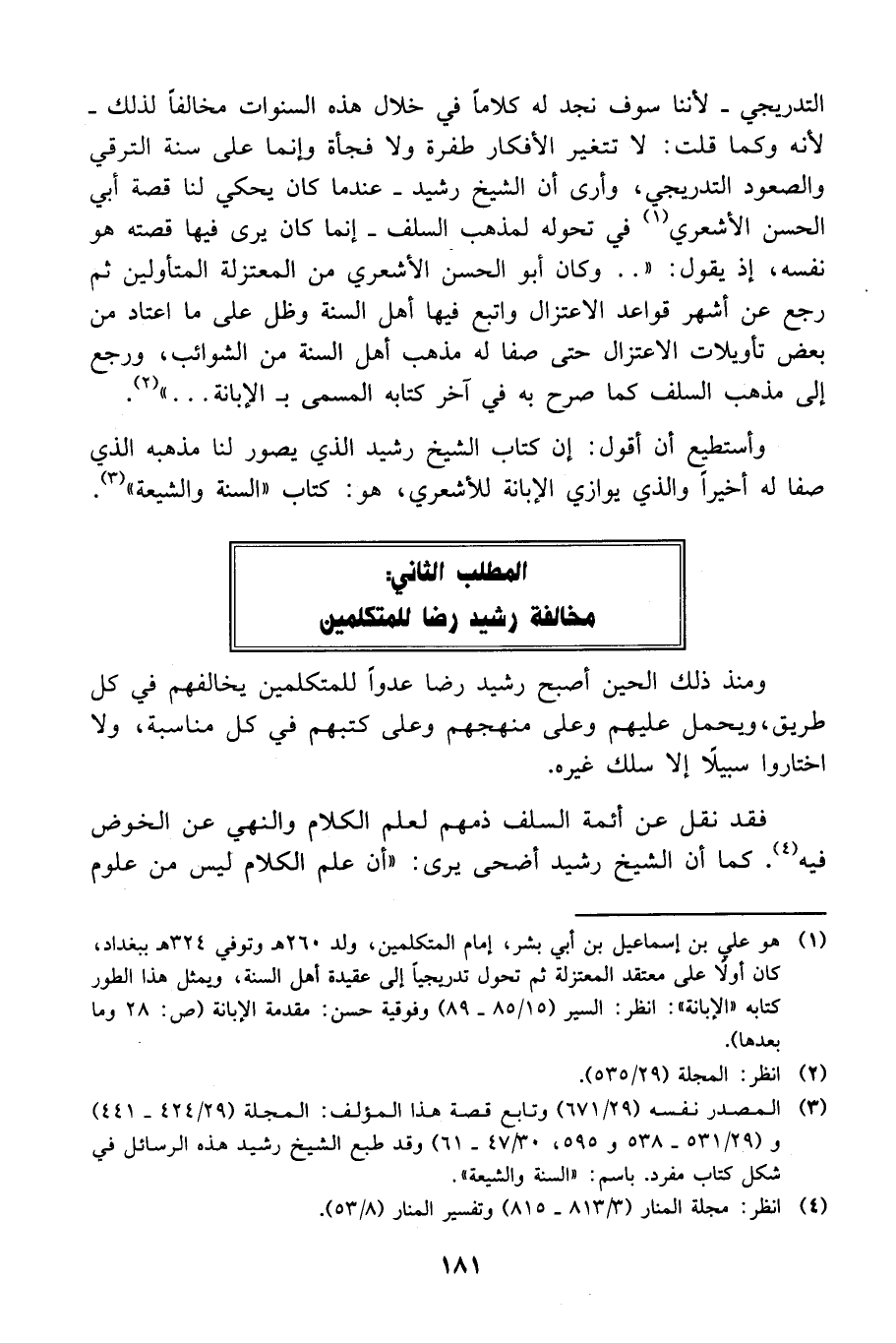 وأستطيع أن أقول: إن كتاب الشيخ رشيد الذي يصور لنا مذهبه الذي صفا له أخيراً والذي يوازي الإبانة للأشعري، هو: كتاب "السنة والشيعة" 3.