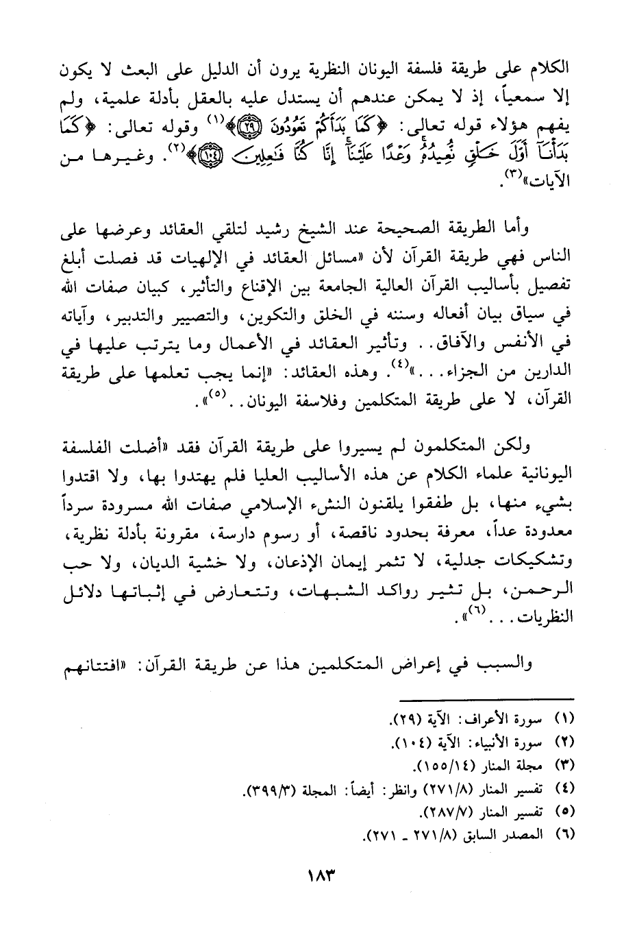 الكلام على طريقة فلسفة اليونان النظرية يرون أن الدليل على البعث لا يكون إلا سمعياً، إذ لا يمكن عندهم أن يستدل عليه بالعقل بأدلة علمية، ولم يفهم هؤلاء قوله تعالى: {كَمَا بَدَأَكُمْ تَعُودُونَ} 1 وقوله تعالى: {كَمَا بَدَأْنَا أَوَّلَ خَلْقٍ نُعِيدُهُ وَعْداً عَلَيْنَا إِنَّا كُنَّا فَاعِلِينَ} 2. وغيرها من الآيات" 3.
