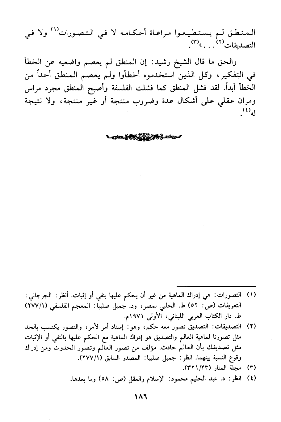المنطق لم يستطيعوا مراعاة أحكامه لا في التصورات 1 ولا في التصديقات 2…" 3.