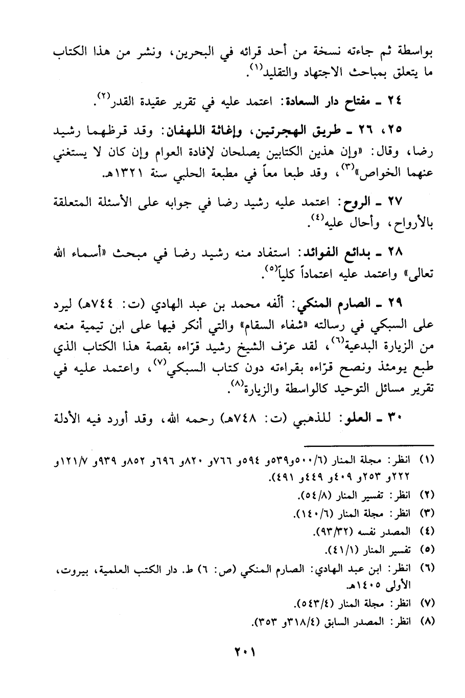 29 ـ الصارم المنكي: ألّفه محمد بن عبد الهادي (ت: 744هـ) ليرد على السبكي في رسالته "شفاء السقام" والتي أنكر فيها على ابن تيمية منعه من الزيارة البدعية 6، لقد عرّف الشيخ رشيد قرّاءه بقصة هذا الكتاب الذي طبع يومئذ ونصح قرّاءه بقراءته دون كتاب السبكي 7، واعتمد عليه في تقرير مسائل التوحيد كالواسطة والزيارة 8.