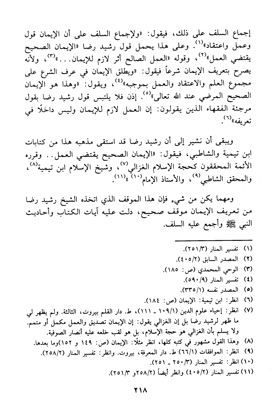 ويبقى أن نشير إلى أن رشيد رضا قد استقى مذهبه هذا من كتابات ابن تيمية والشاطبي، فيقول: "الإيمان الصحيح يقتضي العمل.. وقرره الأئمة المحققون كحجة الإسلام الغزالي 7 وشيخ الإسلام ابن تيمية 8 والمحقق الشاطبي 9 والأستاذ الإمام 10." 11.
