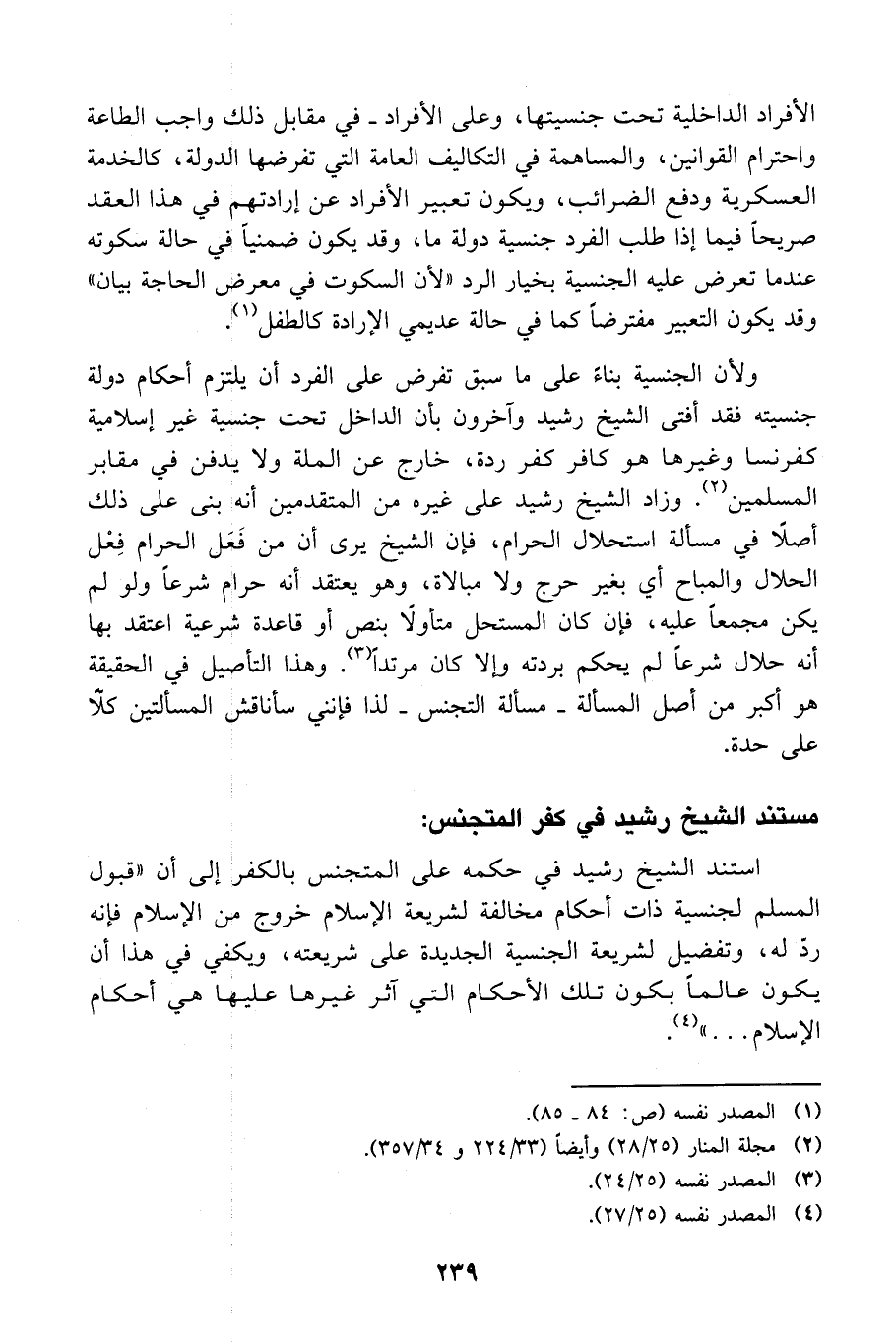 ولأن الجنسية بناءً على ما سبق تفرض على الفرد أن يلتزم أحكام دولة جنسيته فقد أفتى الشيخ رشيد وآخرون بأن الداخل تحت جنسية غير إسلامية كفرنسا وغيرها هو كافر كفر ردة، خارج عن الملة ولا يدفن في مقابر المسلمين 2. وزاد الشيخ رشيد على غيره من المتقدمين أنه بنى على ذلك أصلاً في مسألة استحلال الحرام، فإن الشيخ يرى أن من فَعَل الحرام فِعْل الحلال والمباح أي بغير حرج ولا مبالاة، وهو يعتقد أنه حرام شرعاً ولو لم يكن مجمعاً عليه، فإن كان المستحل متأولاً بنص أو قاعدة شرعية اعتقد بها أنه حلال شرعاً لم يحكم بردته وإلا كان مرتداً 3. وهذا التأصيل في الحقيقة هو أكبر من أصل المسألة ـ مسألة التجنس ـ لذا فإنني سأناقش المسألتين كلاًّ على حدة.
