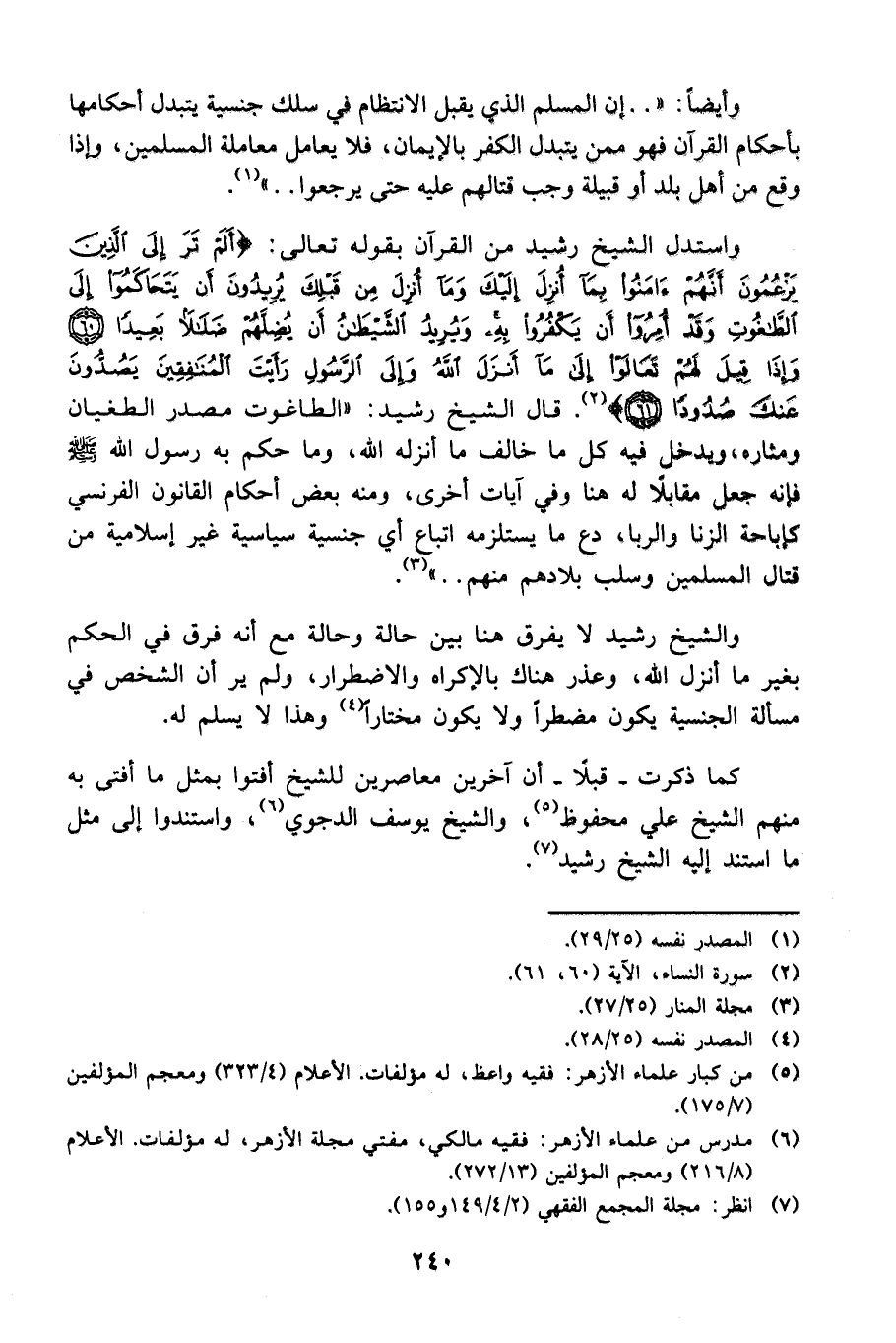 والشيخ رشيد لا يفرق هنا بين حالة وحالة مع أنه فرق في الحكم بغير ما أنزل الله، وعذر هناك بالإكراه والاضطرار، ولم ير أن الشخص في مسألة الجنسية يكون مضطراً ولا يكون مختاراً 4 وهذا لا يسلم له.