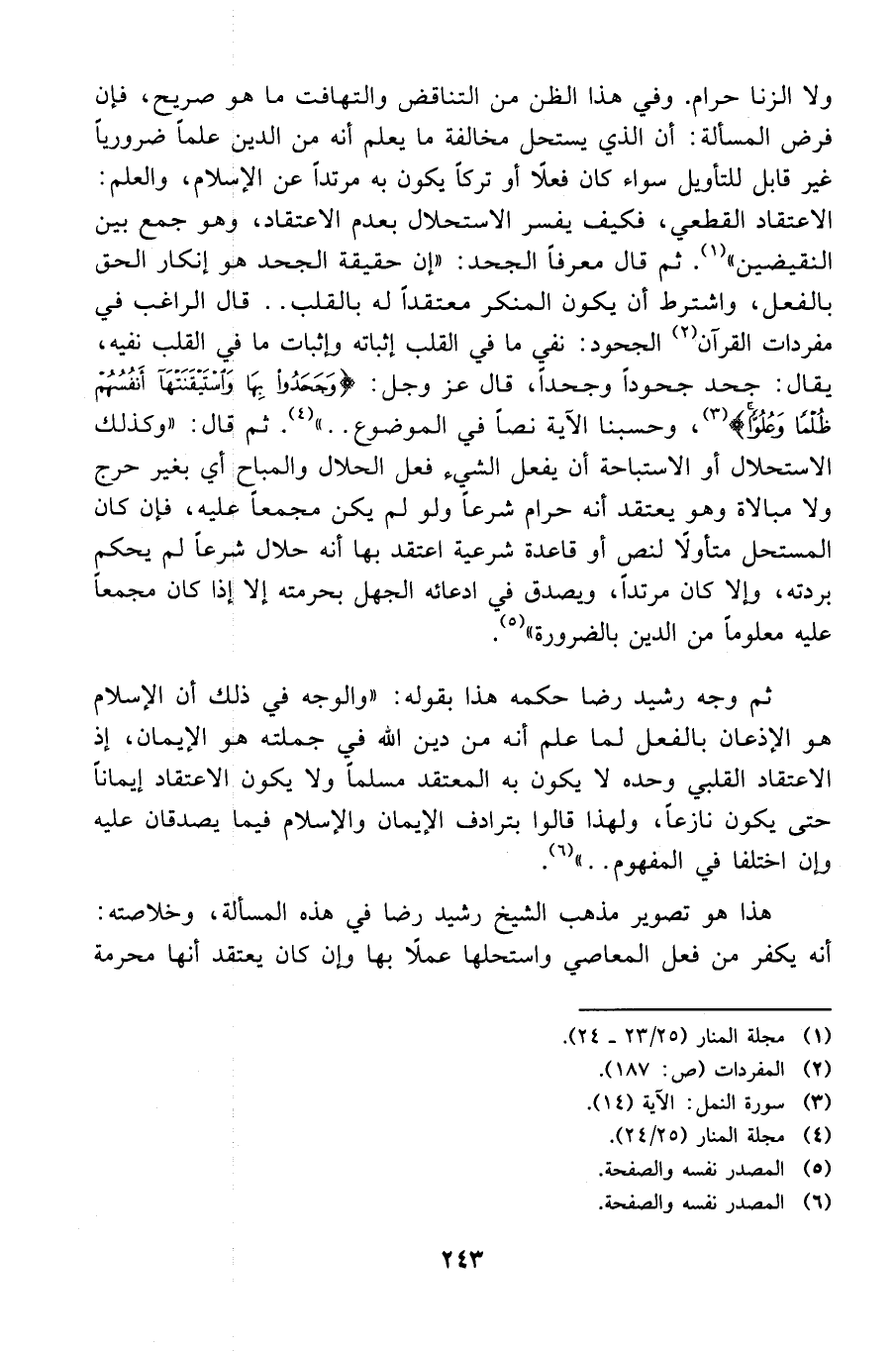 ولا الزنا حرام. وفي هذا الظن من التناقض والتهافت ما هو صريح، فإن فرض المسألة: أن الذي يستحل مخالفة ما يعلم أنه من الدين علماً ضرورياً غير قابل للتأويل سواء كان فعلاً أو تركاً يكون به مرتداً عن الإسلام، والعلم: الاعتقاد القطعي، فكيف يفسر الاستحلال بعدم الاعتقاد، وهو جمع بين النقيضين" 1. ثم قال معرفاً الجحد: " إن حقيقة الجحد هو إنكار الحق بالفعل، واشترط أن يكون المنكر معتقداً له بالقلب.. قال الراغب في مفردات القرآن 2 الجحود: نفي ما في القلب إثباته وإثبات ما في القلب نفيه، يقال: جحد جحوداً وجحداً، قال عزوجل: {وَجَحَدُوا بِهَا وَاسْتَيْقَنَتْهَا أَنْفُسُهُمْ ظُلْماً وَعُلُوّاً} 3، وحسبنا الآية نصاً في الموضوع.." 4. ثم قال: " وكذلك الاستحلال أو الاستباحة أن يفعل الشيء فعل الحلال والمباح أي بغير حرج ولا مبالاة وهو يعتقد أنه حرام شرعاً ولو لم يكن مجمعاً عليه، فإن كان المستحل متأولاً لنص أو قاعدة شرعية اعتقد بها أنه حلال شرعاًلم يحكم بردته، وإلا كان مرتداً، ويصدق في ادعائه الجهل بحرمته إلا إذا كان مجمعاً عليه معلوماً من الدين بالضرورة" 5.