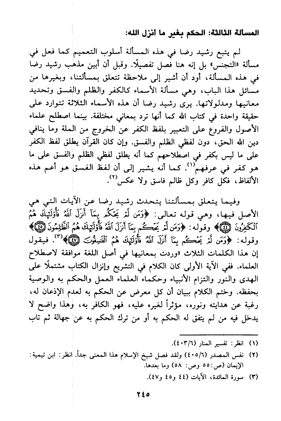 وفيما يتعلق بمسألتنا يتحدث رشيد رضا عن الآيات التي هي الأصل فيها، وهي قوله تعالى: {وَمَنْ لَمْ يَحْكُمْ بِمَا أَنْزَلَ اللَّهُ فَأُولَئِكَ هُمُ الْكَافِرُونَ} وقوله: {وَمَنْ لَمْ يَحْكُمْ بِمَا أَنْزَلَ اللَّهُ فَأُولَئِكَ هُمُ الظَّالِمُونَ} وقوله: {وَمَنْ لَمْ يَحْكُمْ بِمَا أَنْزَلَ اللَّهُ فَأُولَئِكَ هُمُ الْفَاسِقُونَ} 3. فيقول إن هذا الكلمات الثلاث "وردت بمعانيها في أصل اللغة موافقة لاصطلاح العلماء. ففي الآية الأولى كان الكلام في التشريع وإنزال الكتاب مشتملاً على الهدى والنور والتزام الأنبياء وحكماء العلماء العمل والحكم به والوصية بحفظه. وختم الكلام ببيان أن كل معرض عن الحكم به لعدم الإذعان له، رغبة عن هدايته ونوره، مؤثراً لغيره عليه، فهو الكافر به، وهذا واضح لا يدخل فيه من لم يتفق له الحكم به أو من ترك الحكم به عن جهالة ثم تاب