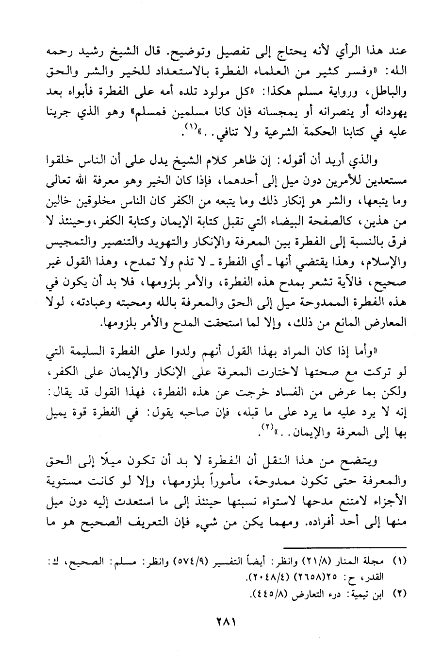 والذي أريد أن أقوله: إن ظاهر كلام الشيخ يد ل على أن الناس خلقوا مستعدين للأمرين دون ميل إلى أحدهما، فإذا كان الخير وهو معرفة الله تعالى وما يتبعها، والشر هو إنكار ذلك وما يتبعه من الكفر كان الناس مخلوقين خالين من هذين، كالصفحة البيضاء التي تقبل كتابة الإيمان وكتابة الكفر، وحينئذ لا فرق بالنسبة إلى الفطرة بين المعرفة والإنكار والتهويد والتنصير والتمجيس والإسلام، وهذا يقتضي أنها ـ أي الفطرة ـ لا تذم ولا تمدح، وهذا القول غير صحيح، فالآية تشعر بمدح هذه الفطرة، والأمر بلزومها، فلا بد أن يكون في هذه الفطرة الممدوحة ميل إلى الحق والمعرفة بالله ومحبته وعبادته، لولا المعارض المانع من ذلك، وإلا لما استحقت المدح والأمر بلزومها.