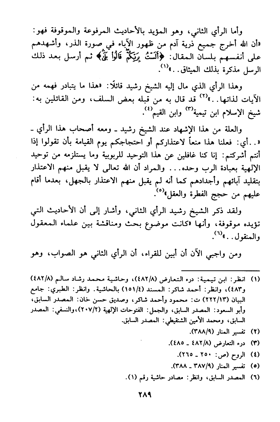 وأما الرأي الثاني، وهو المؤيد بالأحاديث المرفوعة والموقوفة فهو: "أن الله أخرج جميع ذرية آدم من ظهور الآباء في صورة الذر، وأشهدهم على أنفسهم بلسان المقال: {أَلَسْتُ بِرَبِّكُمْ قَالُوا بَلَى} ثم أرسل بعد ذلك الرسل مذكرة بذلك الميثاق.." 1.