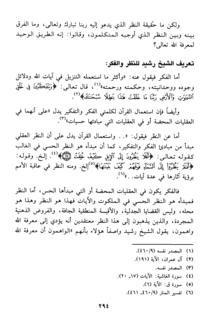 فالفكر يكون في العقليات المحضة أو التي مبدأها الحس، أما النظر فمبدأه هو النظر الحسي في الملكوت والآيات فهذا هو النظر وهذا هو محله، وليس القضايا الجدلية، والأقيسة المنطقية الجافة، والفروض الذهنية المجردة، والذين يذهبون إلى هذا النظر معتقدين أنه يؤدي إلى معرفة الله واهمون، يقول الشيخ رشيد واصفاً هؤلاء بأنهم "الواهمون أن معرفة الله