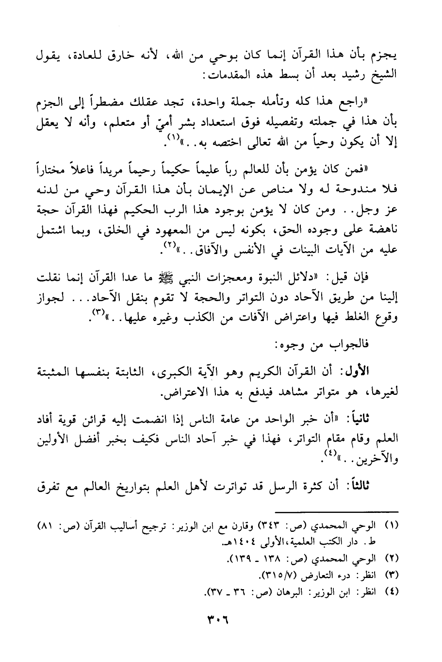 1 الوحي المحمدي (ص: 343) وقارن مع ابن الوزير: ترجيح أساليب القرآن (ص: 81) ط. دار الكتب العلمية، الأولى 1404هـ