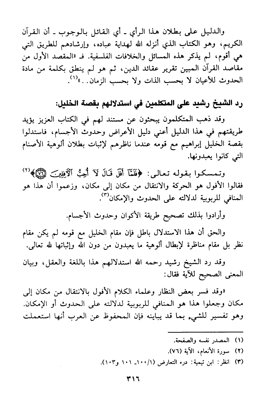 رد الشيخ رشيد على المتكلمين في استدلالهم بقصة الخليل:
