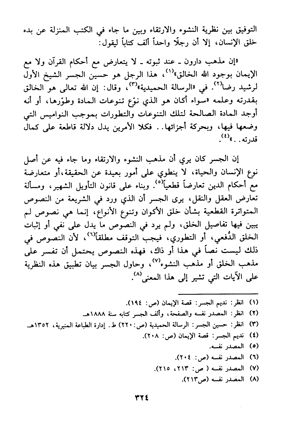 "إن مذهب دارون ـ عند ثبوته ـ لا يتعارض مع أحكام القرآن ولا مع الإيمان بوجود الله الخالق" 1، هذا الرجل هو حسين الجسر الشيخ الأول لرشيد رضا 2. في "الرسالة الحميدية" 3، وقال: إن الله تعالى هو الخالق بقدرته وعلمه "سواء أكان هو الذي نوّع تنوعات المادة وطوّرها، أو أنه أوجد المادة الصالحة لتلك التنوعات والتطورات بموجب النواميس التي وضعها فيها، وبحركة أجزائها.. فكلا الأمرين يدل دلالة قاطعة على كمال قدرته.. " 4.