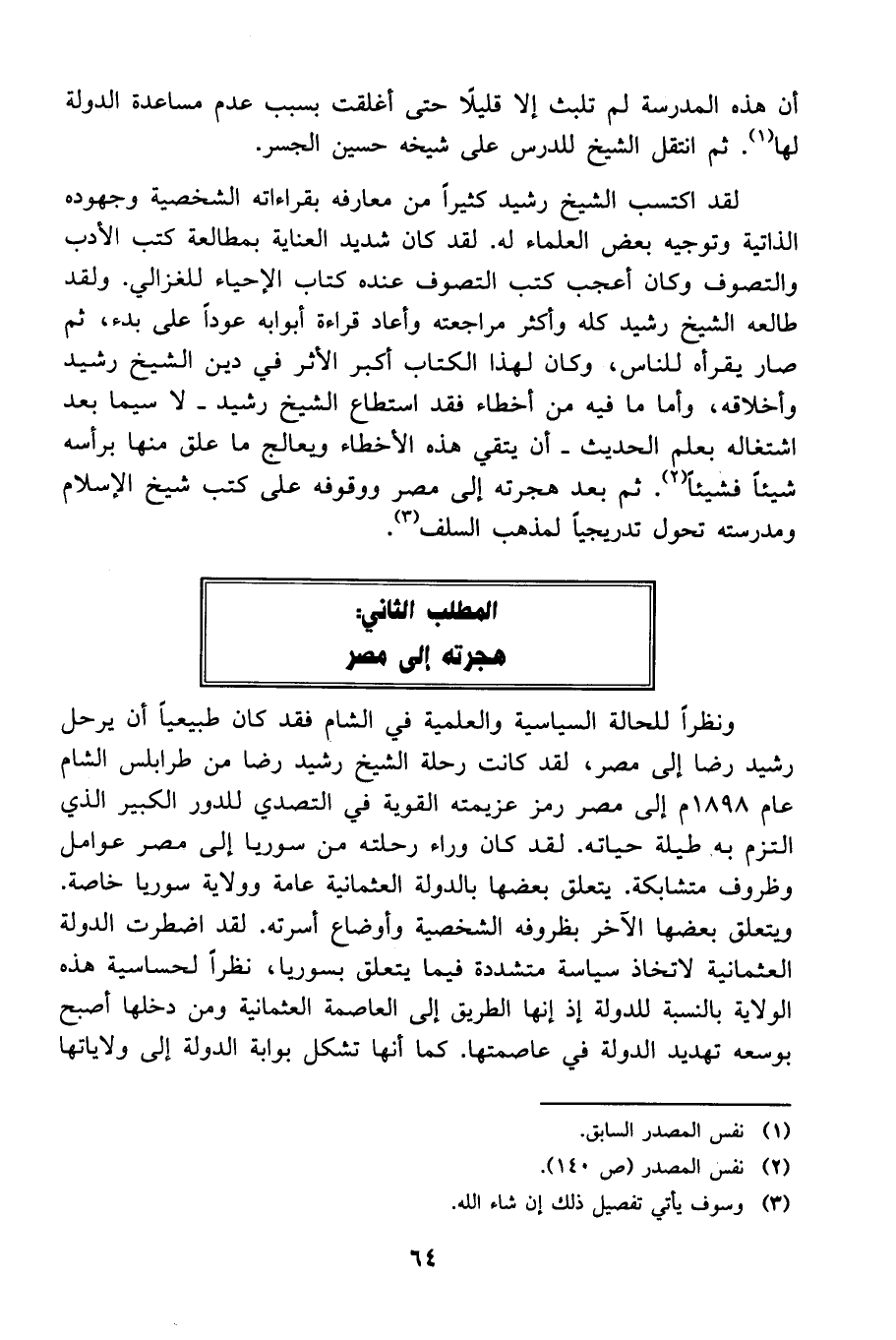ونظراً للحالة السياسية والعلمية في الشام فقد كان طبيعياً أن يرحل رشيد رضا إلى مصر، لقد كانت رحلة الشيخ رشيد رضا من طرابلس الشام عام 1898م إلى مصر رمز عزيمته القوية في التصدي للدور الكبير الذي التزم به طيلة حياته. لقد كان وراء رحلته من سوريا إلى مصر عوامل وظروف متشابكة. يتعلق بعضها بالدولة العثمانية عامة وولاية سوريا خاصة. ويتعلق بعضها الآخر بظروفه الشخصية وأوضاع أسرته. لقد اضطرت الدولة العثمانية لاتخاذ سياسة متشددة فيما يتعلق بسوريا، نظراً لحساسية هذه الولاية بالنسبة للدولة إذ إنها الطريق إلى العاصمة العثمانية ومن دخلها أصبح بوسعه تهديد الدولة في عاصمتها. كما أنها تشكل بوابة الدولة إلى ولاياتها
