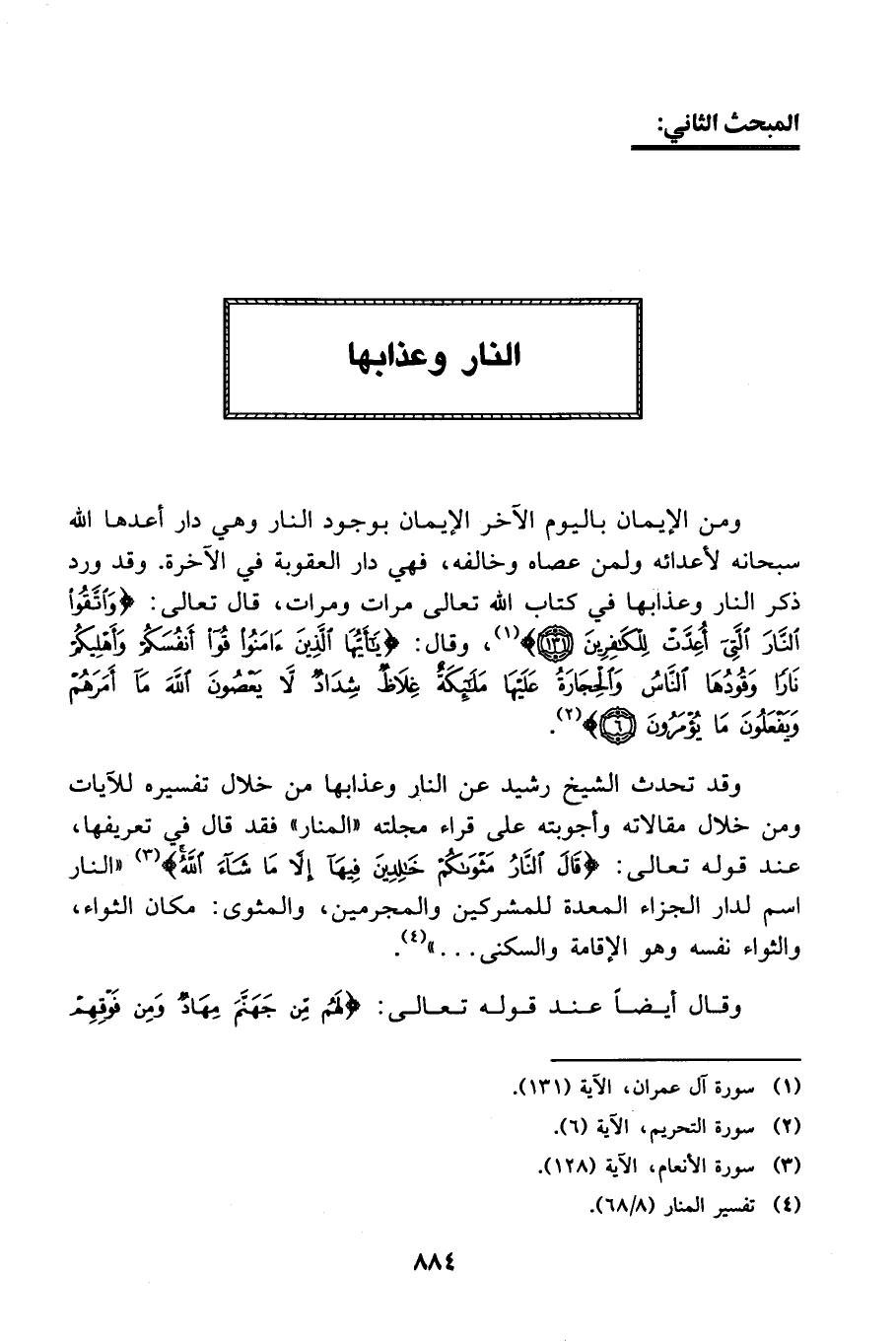 ومن الإيمان باليوم الآخر الإيمان بوجود النار وهي دار أعدها الله سبحانه لأعدائه ولمن عصاه وخالفه، فهي دار العقوبة في الآخرة. وقد ورد ذكر النار وعذابها في كتاب الله تعالى مرات ومرات، قال تعالى: {وَاتَّقُوا النَّارَ الَّتِي أُعِدَّتْ لِلْكَافِرِينَ} 1، وقال: {يَا أَيُّهَا الَّذِينَ آمَنُوا قُوا أَنْفُسَكُمْ وَأَهْلِيكُمْ نَاراً وَقُودُهَا النَّاسُ وَالْحِجَارَةُ عَلَيْهَا مَلائِكَةٌ غِلاظٌ شِدَادٌ لا يَعْصُونَ اللَّهَ مَا أَمَرَهُمْ وَيَفْعَلُونَ مَا يُؤْمَرُونَ} 2.