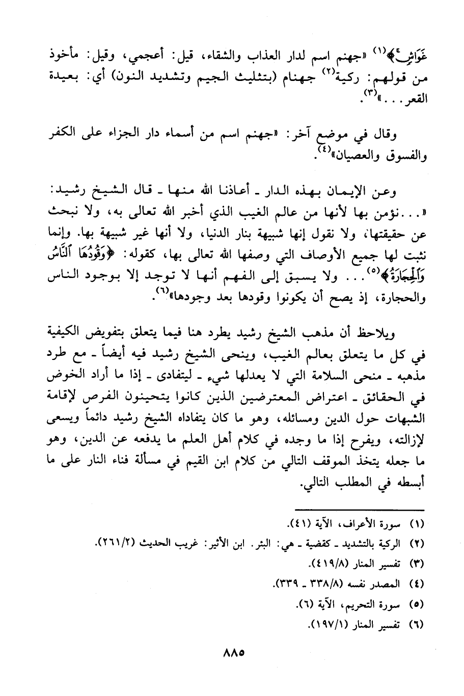 ويلاحظ أن مذهب الشيخ رشيد يطرد هنا فيما يتعلق بتفويض الكيفية في كل ما يتعلق بعالم الغيب، وينحى الشيخ رشيد فيه أيضاً ـ مع طرد مذهبه ـ منحى السلامة التي لا يعدلها شيء ـ ليتفادى ـ إذا ما أراد الخوض في الحقائق ـ اعتراض المعترضين الذين كانوا يتحينون الفرص لإقامة الشبهات حول الدين ومسائله، وهو ما كان يتفاداه الشيخ رشيد دائماً ويسعى لإزالته، ويفرح إذا ما وجده في كلام أهل العلم ما يدفعه عن الدين، وهو ما جعله يتخذ الموقف التالي من كلام ابن القيم في مسألة فناء النار على ما أبسطه في المطلب التالي.